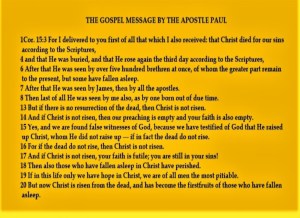 The basic scriptures above are taught by just about all Christian Churches. This is the one common tie between all of the body of Christ. The Apostle Paul thought it was necessary to go over these scriptures to affirm that the Corinthian Church thoroughly and correctly understood the Gospel message. It does us good to study and reflect upon Christ’s Gospel so we will also stay on the right course and not let anyone miss lead us by teaching a different gospel. Blessed be the name of our Lord and Savior Jesus Christ who with His own body established the Gospel!