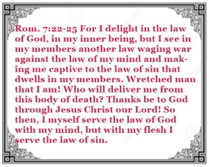 Romans 7:20-25 Now if I do what I will not to do, it is no longer I who do it, but sin that dwells in me. I find then a law, that evil is present with me, the one who wills to do good. For I delight in the law of God according to the inward man. But I see another law in my members, warring against the law of my mind (New Covenant), and bringing me into captivity to the law of sin which is in my members. O wretched man that I am! Who will deliver me from this body of death? I thank God — through Jesus Christ our Lord! So then, with the mind I myself serve the law of God, but with the flesh the law of sin.