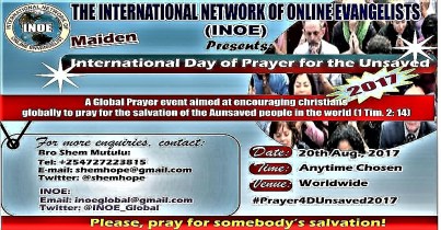 God stirs up His righteousness in believers to accomplish His agenda by instituting a special day for the purpose of praying for the unsaved. Therefore: International Network of Online Evangelists has announced the first ever “International Day of Prayer For The unsaved—2017” to start on August 20, 2017, just 12 more days from now. This is a worldwide event! Please, take a minimum of just 5 minutes or however long your heart desires for this most important counterattack against Satan the Devil. Will you join us in the most powerful prayer engagement in history made possible by, ”the blessing of the internet” making the world accessible?